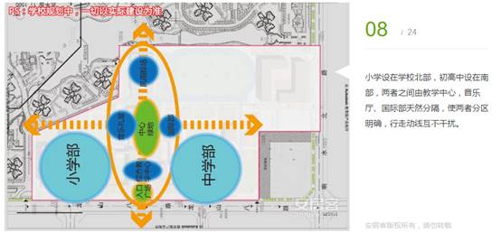 小學(xué)設(shè)在學(xué)校北部,初高中設(shè)在南部,兩者之間由教學(xué)中心,音樂廳、國際部天然分隔,使兩者分區(qū)明確,行走動(dòng)線互不干擾。