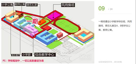 一期將建設(shè)小學(xué)教學(xué)綜合樓、風(fēng)雨操場、音樂禮堂及A、B棟學(xué)生公寓、教師公寓。