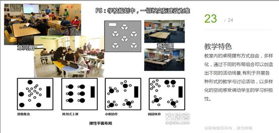 教室內(nèi)的桌椅擺布方式自由,多樣化,通過不同的布局組合可以創(chuàng)造出不同的活動(dòng)場景,有利于開展各種形式的教學(xué)與討論活動(dòng),以多樣化的空間感受調(diào)動(dòng)學(xué)生的學(xué)習(xí)積極性。